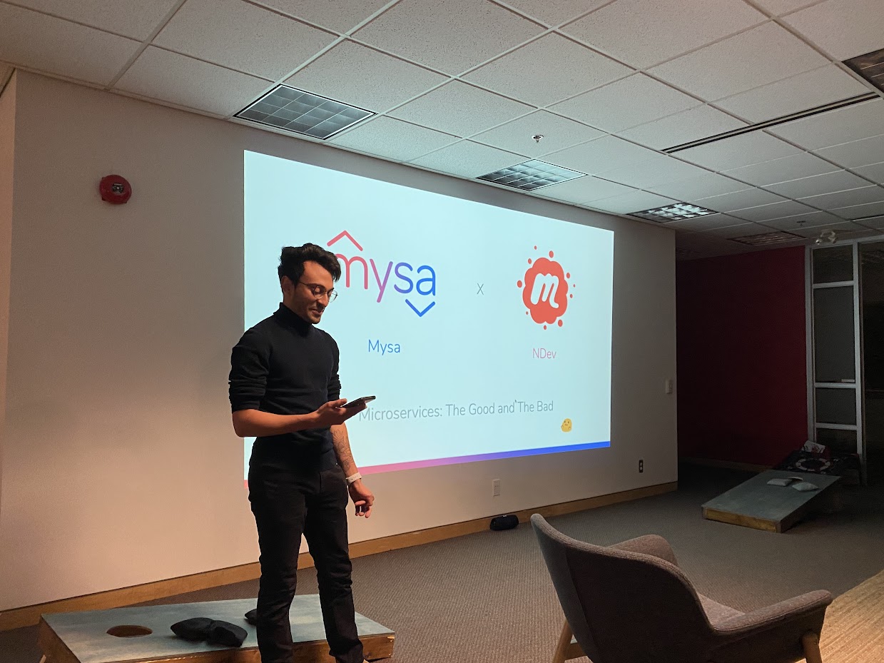 Mysa's group photo in 2019 (with me ecstatically pointing at the Mysa logo 😂)